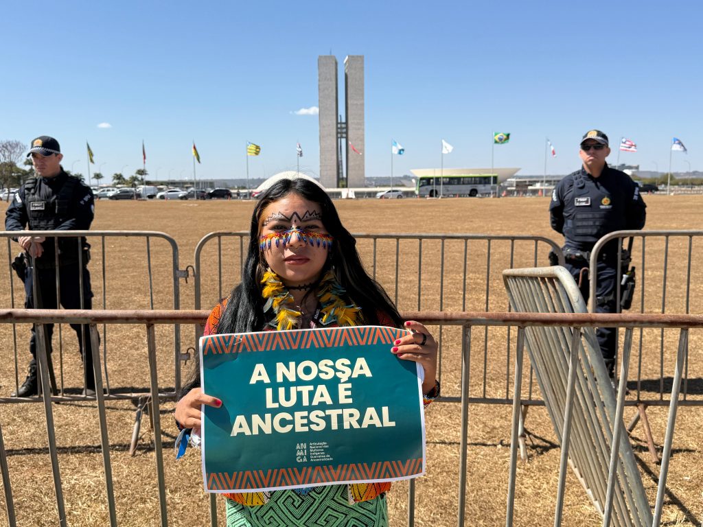 While Indigenous women march to defend life, water, and the forest, institutions remain distant, shielded by weapons and walls. The framing of the photo transforms Bimi Pinu’s act of resistance into a visual denunciation: the struggle for the Amazon and for Indigenous peoples is also a struggle for recognition, dialogue, and the opening of political structures to those who most directly suffer the impacts of the decisions made within those walls.