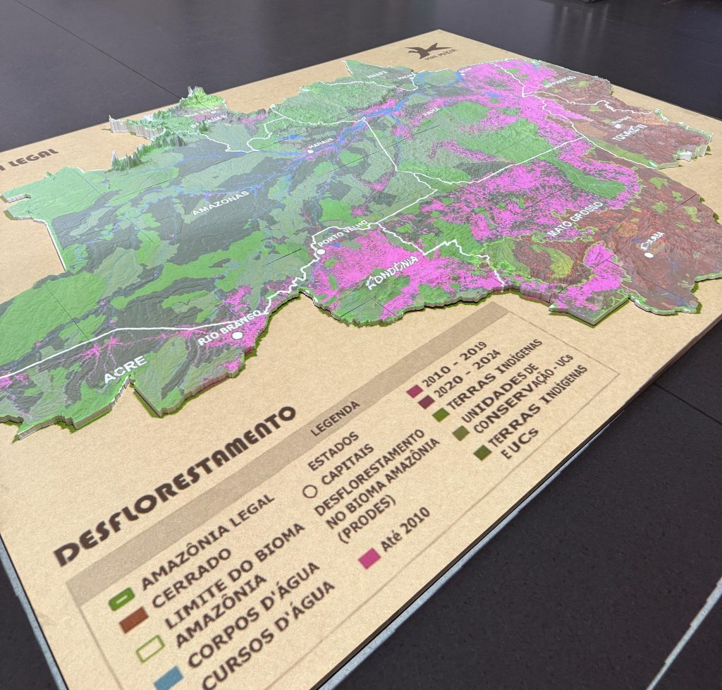 Through light projections and data overlays, people can explore how the forest is changing — and what’s at stake. The model also invites reflection on the lived experiences of Indigenous Peoples in the Amazon who are on the frontlines of climate change, defending their land and our planet’s future.